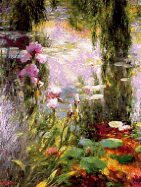 Ориентировочно так, схема вышивки «GREG SINGLEY», созданная автором malkinaiv, будет выглядеть при отшиве на канве. Размер данной вышивки равен 144x190 крестов, при этом используется 89 цветов. Ключевые слова, по которым можно найти эту схему: картиина, цветы, парки, пруд, отражения. Также, вы можете взглянуть на оригинальную картинку, соответствующую данной схеме вышивки.