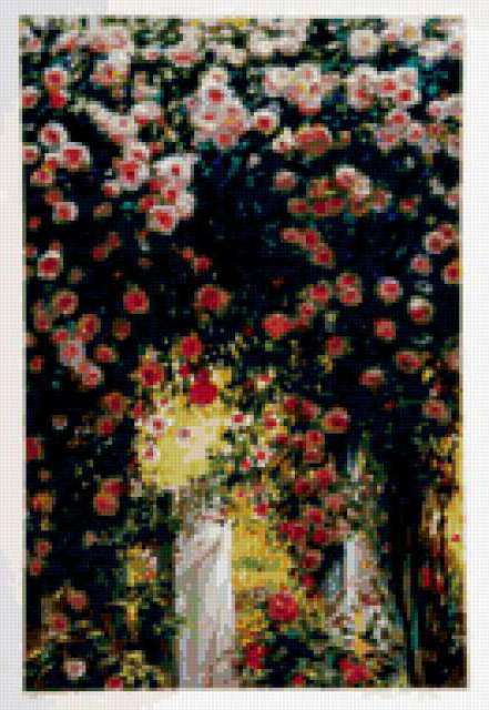 Ориентировочно так, схема вышивки «GREG SINGLEY», созданная автором malkinaiv, будет выглядеть при отшиве на канве. Размер данной вышивки равен 131x190 крестов, при этом используется 62 цветов. Ключевые слова, по которым можно найти эту схему: картина, цветы, розы, калитка, сады. Также, вы можете взглянуть на оригинальную картинку, соответствующую данной схеме вышивки.