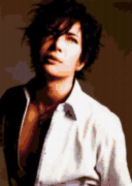 Ориентировочно так, схема вышивки «Gackt», созданная автором Jein2, будет выглядеть при отшиве на канве. Размер данной вышивки равен 128x180 крестов, при этом используется 29 цветов. Ключевые слова, по которым можно найти эту схему: gackt, j-rock, музыка. Также, вы можете взглянуть на оригинальную картинку, соответствующую данной схеме вышивки.