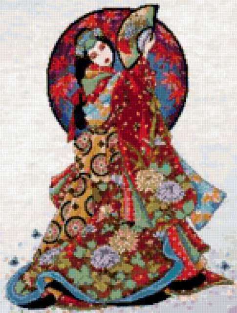 Ориентировочно так, схема вышивки «Geisha», созданная автором aniela, будет выглядеть при отшиве на канве. Размер данной вышивки равен 144x190 крестов, при этом используется 87 цветов. Ключевые слова, по которым можно найти эту схему: девушка, восток, lady, woman, женщина. Также, вы можете взглянуть на оригинальную картинку, соответствующую данной схеме вышивки.