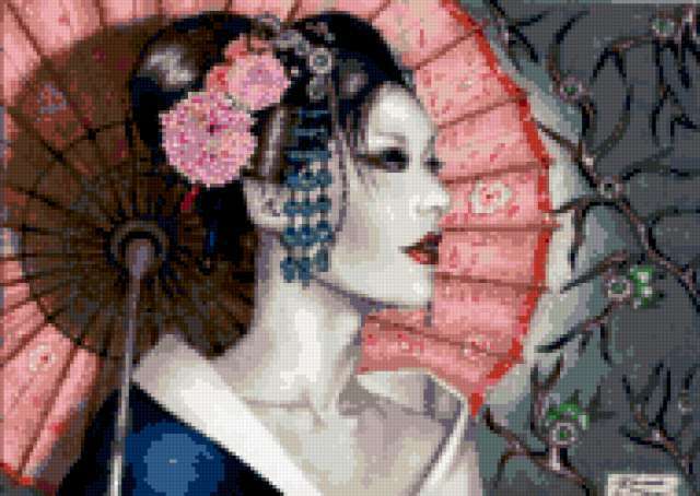 Ориентировочно так, схема вышивки «Geisha», созданная автором lukrecija12, будет выглядеть при отшиве на канве. Размер данной вышивки равен 190x135 крестов, при этом используется 48 цветов. Ключевые слова, по которым можно найти эту схему: zenshina, vostok. Также, вы можете взглянуть на оригинальную картинку, соответствующую данной схеме вышивки.