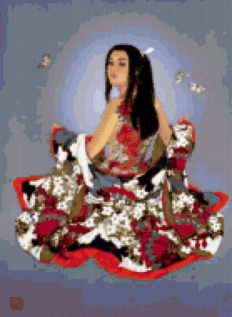 Ориентировочно так, схема вышивки «Geisha», созданная автором lukrecija12, будет выглядеть при отшиве на канве. Размер данной вышивки равен 139x190 крестов, при этом используется 58 цветов. Ключевые слова, по которым можно найти эту схему: zenshina, vostok. Также, вы можете взглянуть на оригинальную картинку, соответствующую данной схеме вышивки.