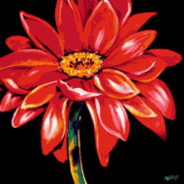 Ориентировочно так, схема вышивки «Gerbera», созданная автором aniela, будет выглядеть при отшиве на канве. Размер данной вышивки равен 190x190 крестов, при этом используется 60 цветов. Ключевые слова, по которым можно найти эту схему: цветы, flowers. Также, вы можете взглянуть на оригинальную картинку, соответствующую данной схеме вышивки.