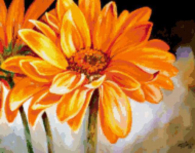 Ориентировочно так, схема вышивки «Gerbera», созданная автором aniela, будет выглядеть при отшиве на канве. Размер данной вышивки равен 190x149 крестов, при этом используется 76 цветов. Ключевые слова, по которым можно найти эту схему: цветы, flowers. Также, вы можете взглянуть на оригинальную картинку, соответствующую данной схеме вышивки.
