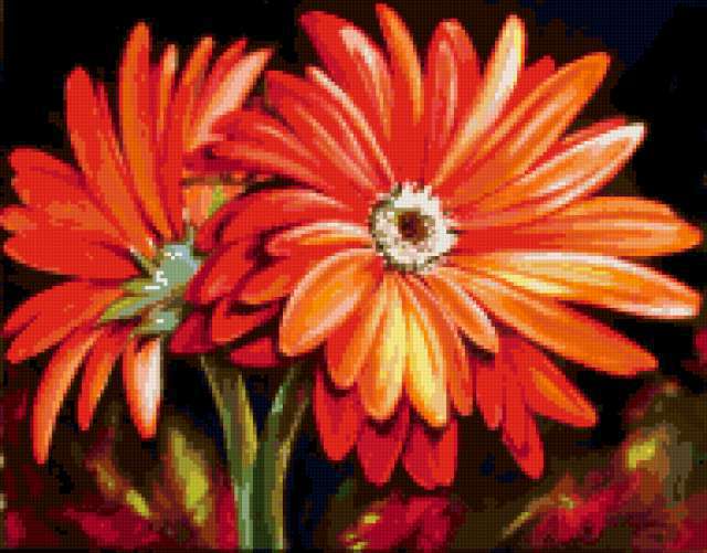 Ориентировочно так, схема вышивки «Gerbera», созданная автором aniela, будет выглядеть при отшиве на канве. Размер данной вышивки равен 190x149 крестов, при этом используется 56 цветов. Ключевые слова, по которым можно найти эту схему: цветы, flowers. Также, вы можете взглянуть на оригинальную картинку, соответствующую данной схеме вышивки.