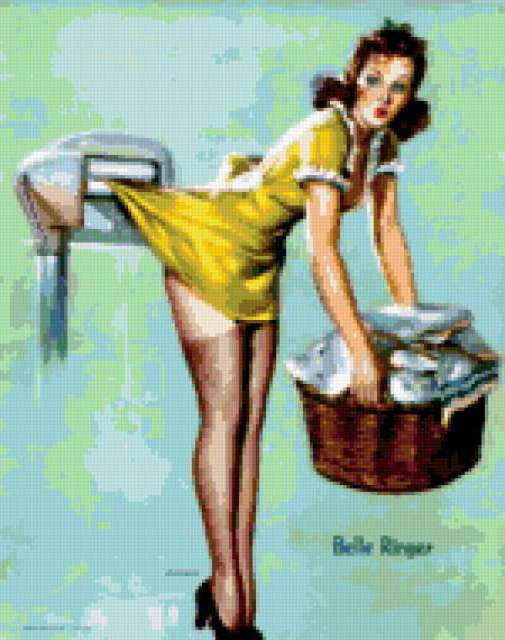 Ориентировочно так, схема вышивки «Gil Elvgren», созданная автором AllaBira, будет выглядеть при отшиве на канве. Размер данной вышивки равен 150x190 крестов, при этом используется 68 цветов. Ключевые слова, по которым можно найти эту схему: body. Также, вы можете взглянуть на оригинальную картинку, соответствующую данной схеме вышивки.