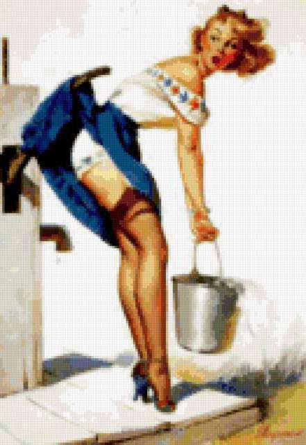 Ориентировочно так, схема вышивки «Gil Elvgren», созданная автором AllaBira, будет выглядеть при отшиве на канве. Размер данной вышивки равен 131x190 крестов, при этом используется 78 цветов. Ключевые слова, по которым можно найти эту схему: body. Также, вы можете взглянуть на оригинальную картинку, соответствующую данной схеме вышивки.