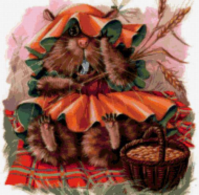 Ориентировочно так, схема вышивки «Hamster», созданная автором aniela, будет выглядеть при отшиве на канве. Размер данной вышивки равен 190x186 крестов, при этом используется 80 цветов. Ключевые слова, по которым можно найти эту схему: wildlife, animals, животные. Также, вы можете взглянуть на оригинальную картинку, соответствующую данной схеме вышивки.