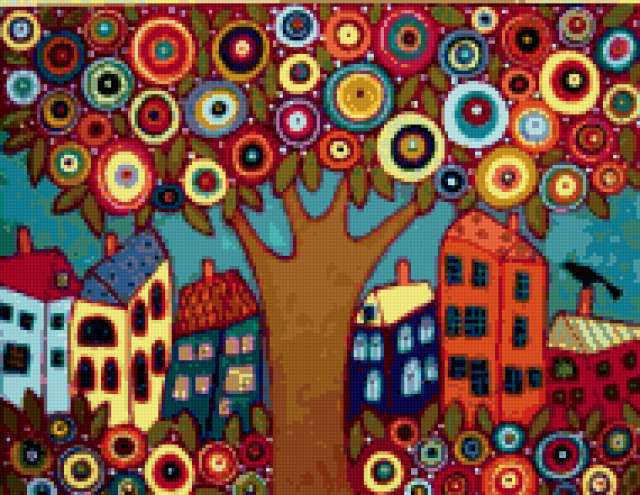 Ориентировочно так, схема вышивки «Happy Village», созданная автором pandreevska, будет выглядеть при отшиве на канве. Размер данной вышивки равен 190x147 крестов, при этом используется 62 цветов. Ключевые слова, по которым можно найти эту схему: village, colorful. Также, вы можете взглянуть на оригинальную картинку, соответствующую данной схеме вышивки.