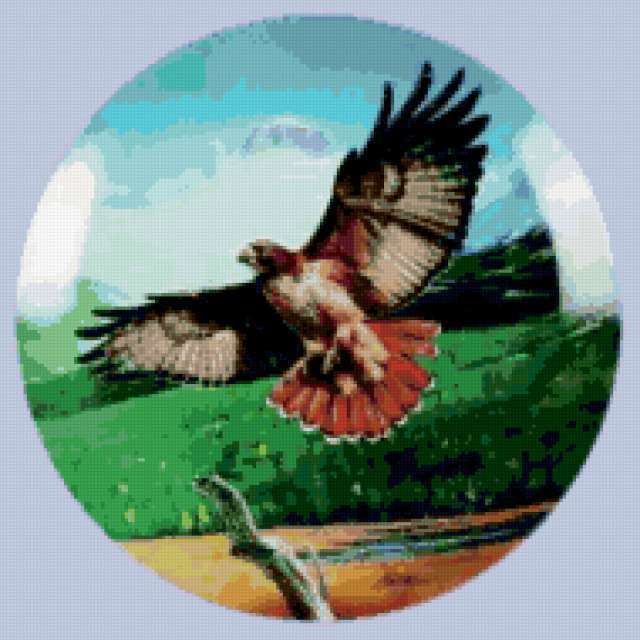 Ориентировочно так, схема вышивки «Hawk», созданная автором aniela, будет выглядеть при отшиве на канве. Размер данной вышивки равен 190x190 крестов, при этом используется 75 цветов. Ключевые слова, по которым можно найти эту схему: wildlife, birds, птицы. Также, вы можете взглянуть на оригинальную картинку, соответствующую данной схеме вышивки.