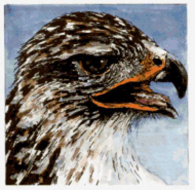 Ориентировочно так, схема вышивки «Hawk», созданная автором aniela, будет выглядеть при отшиве на канве. Размер данной вышивки равен 190x185 крестов, при этом используется 67 цветов. Ключевые слова, по которым можно найти эту схему: wildlife, birds, птицы. Также, вы можете взглянуть на оригинальную картинку, соответствующую данной схеме вышивки.