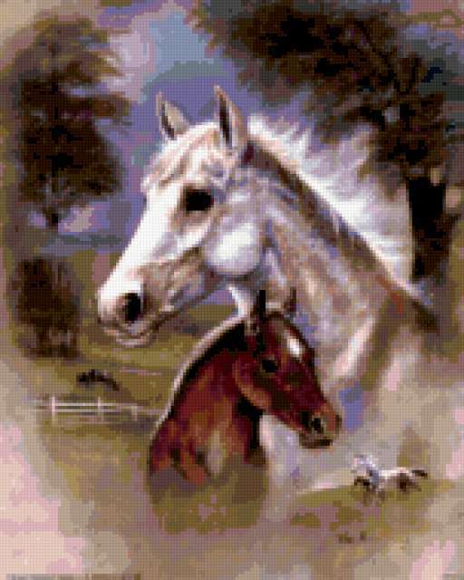 Ориентировочно так, схема вышивки «Horses», созданная автором aniela, будет выглядеть при отшиве на канве. Размер данной вышивки равен 152x190 крестов, при этом используется 60 цветов. Ключевые слова, по которым можно найти эту схему: wildlife, animals, животные, лощадь. Также, вы можете взглянуть на оригинальную картинку, соответствующую данной схеме вышивки.
