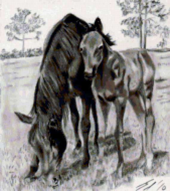 Ориентировочно так, схема вышивки «Horses», созданная автором aniela, будет выглядеть при отшиве на канве. Размер данной вышивки равен 169x190 крестов, при этом используется 43 цветов. Ключевые слова, по которым можно найти эту схему: wildlife, animals, животные, лощадь. Также, вы можете взглянуть на оригинальную картинку, соответствующую данной схеме вышивки.