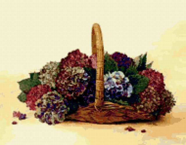 Ориентировочно так, схема вышивки «Hortenzie», созданная автором vesnaromcev, будет выглядеть при отшиве на канве. Размер данной вышивки равен 190x149 крестов, при этом используется 72 цветов. К несчастью, автор не назначил для схемы ключевые слова. Также, вы можете взглянуть на оригинальную картинку, соответствующую данной схеме вышивки.