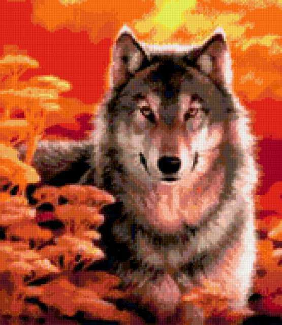 Ориентировочно так, схема вышивки «Hunt», созданная автором aniela, будет выглядеть при отшиве на канве. Размер данной вышивки равен 165x190 крестов, при этом используется 71 цветов. Ключевые слова, по которым можно найти эту схему: Wildlife, animals, Животные, Волк. Также, вы можете взглянуть на оригинальную картинку, соответствующую данной схеме вышивки.