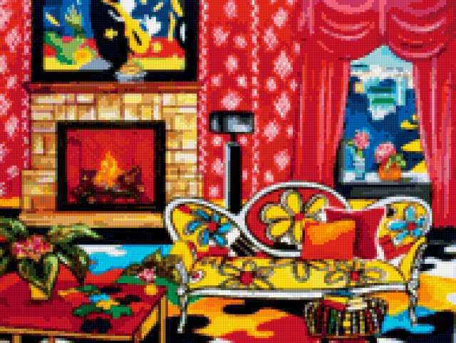 Ориентировочно так, схема вышивки «Interior», созданная автором aniela, будет выглядеть при отшиве на канве. Размер данной вышивки равен 190x143 крестов, при этом используется 80 цветов. Ключевые слова, по которым можно найти эту схему: interior. Также, вы можете взглянуть на оригинальную картинку, соответствующую данной схеме вышивки.
