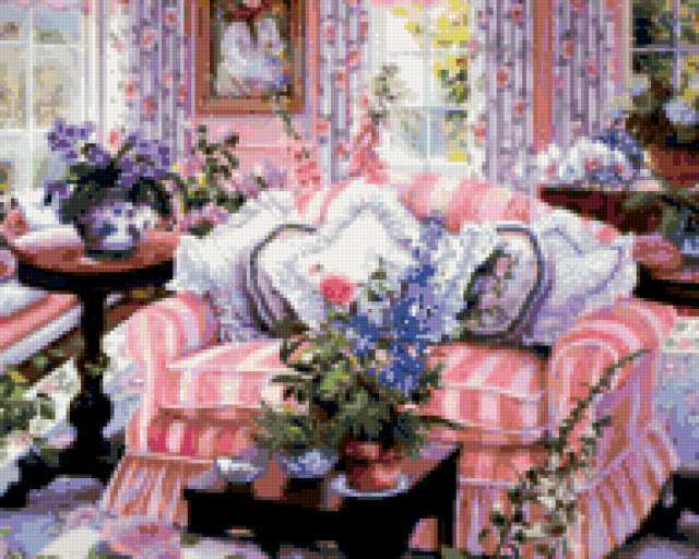 Ориентировочно так, схема вышивки «Interior», созданная автором aniela, будет выглядеть при отшиве на канве. Размер данной вышивки равен 190x152 крестов, при этом используется 77 цветов. Ключевые слова, по которым можно найти эту схему: interior. Также, вы можете взглянуть на оригинальную картинку, соответствующую данной схеме вышивки.