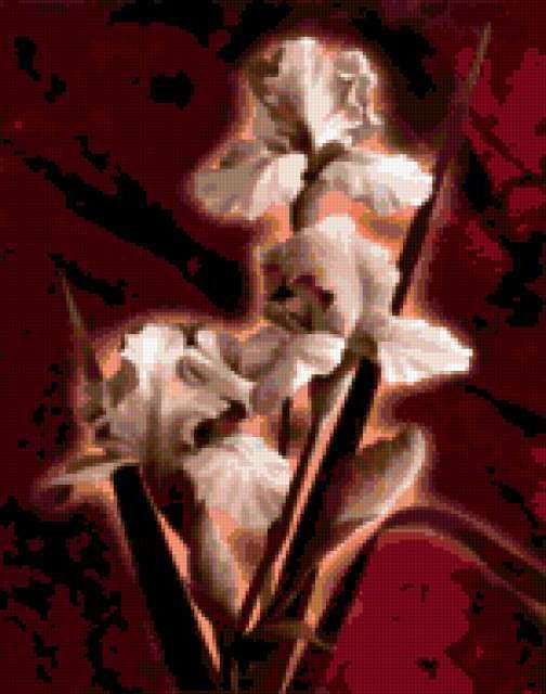 Ориентировочно так, схема вышивки «Iris», созданная автором lukrecija12, будет выглядеть при отшиве на канве. Размер данной вышивки равен 149x189 крестов, при этом используется 33 цветов. Ключевые слова, по которым можно найти эту схему: flower. Также, вы можете взглянуть на оригинальную картинку, соответствующую данной схеме вышивки.