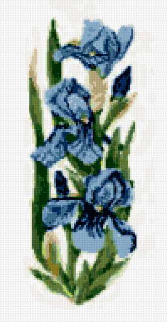 Ориентировочно так, схема вышивки «Iris», созданная автором lukrecija12, будет выглядеть при отшиве на канве. Размер данной вышивки равен 99x190 крестов, при этом используется 28 цветов. Ключевые слова, по которым можно найти эту схему: cvety. Также, вы можете взглянуть на оригинальную картинку, соответствующую данной схеме вышивки.