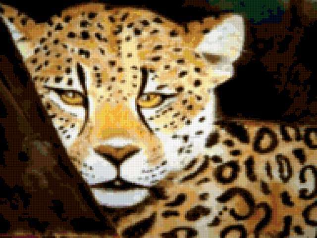 Ориентировочно так, схема вышивки «Jaguar», созданная автором aniela, будет выглядеть при отшиве на канве. Размер данной вышивки равен 190x143 крестов, при этом используется 68 цветов. Ключевые слова, по которым можно найти эту схему: wildlife, animals, животные. Также, вы можете взглянуть на оригинальную картинку, соответствующую данной схеме вышивки.