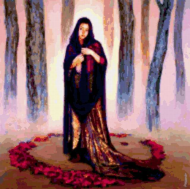 Ориентировочно так, схема вышивки «Jia Lu.», созданная автором avevstigneeva, будет выглядеть при отшиве на канве. Размер данной вышивки равен 190x189 крестов, при этом используется 80 цветов. Ключевые слова, по которым можно найти эту схему: живопись, восточные мотивы, девушка. Также, вы можете взглянуть на оригинальную картинку, соответствующую данной схеме вышивки.