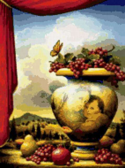 Ориентировочно так, схема вышивки «Kevin Sloan», созданная автором alyasha, будет выглядеть при отшиве на канве. Размер данной вышивки равен 142x190 крестов, при этом используется 67 цветов. Ключевые слова, по которым можно найти эту схему: kevin sloan. Также, вы можете взглянуть на оригинальную картинку, соответствующую данной схеме вышивки.