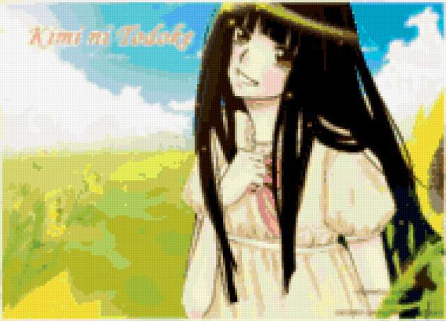 Ориентировочно так, схема вышивки «Kimi ni», созданная автором Miku-chan, будет выглядеть при отшиве на канве. Размер данной вышивки равен 190x137 крестов, при этом используется 60 цветов. Ключевые слова, по которым можно найти эту схему: anime, kawaii. Также, вы можете взглянуть на оригинальную картинку, соответствующую данной схеме вышивки.