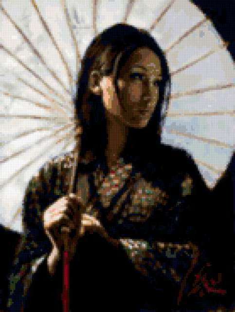 Ориентировочно так, схема вышивки «Kitajanka», созданная автором lukrecija12, будет выглядеть при отшиве на канве. Размер данной вышивки равен 139x184 крестов, при этом используется 46 цветов. Ключевые слова, по которым можно найти эту схему: zenshina, vostok. Также, вы можете взглянуть на оригинальную картинку, соответствующую данной схеме вышивки.
