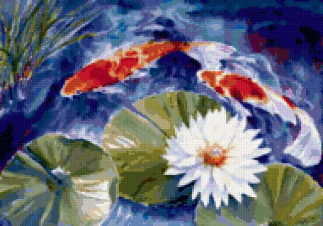 Ориентировочно так, схема вышивки «Koi Fish», созданная автором pandreevska, будет выглядеть при отшиве на канве. Размер данной вышивки равен 190x133 крестов, при этом используется 57 цветов. Ключевые слова, по которым можно найти эту схему: feng shui, flower, koi fish, wealth. Также, вы можете взглянуть на оригинальную картинку, соответствующую данной схеме вышивки.