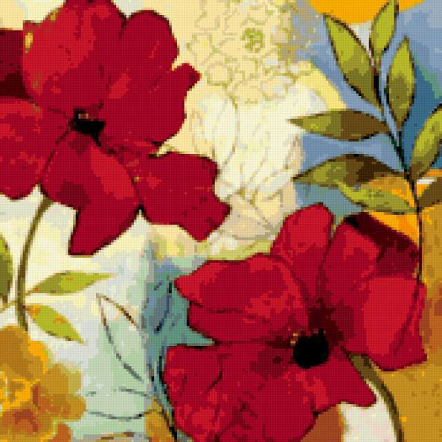 Ориентировочно так, схема вышивки «Kompl 2a», созданная автором Lamisa, будет выглядеть при отшиве на канве. Размер данной вышивки равен 175x175 крестов, при этом используется 52 цветов. Ключевые слова, по которым можно найти эту схему: цветы, cvety, подушка. Также, вы можете взглянуть на оригинальную картинку, соответствующую данной схеме вышивки.