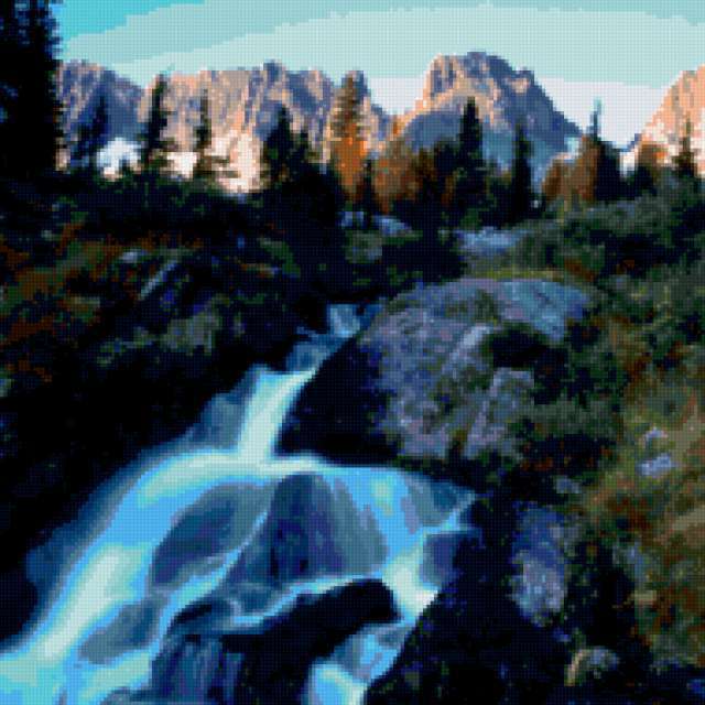 Ориентировочно так, схема вышивки «Kosk», созданная автором aniela, будет выглядеть при отшиве на канве. Размер данной вышивки равен 190x190 крестов, при этом используется 54 цветов. Ключевые слова, по которым можно найти эту схему: водапад, пейзаж, landscape, waterfall. Также, вы можете взглянуть на оригинальную картинку, соответствующую данной схеме вышивки.