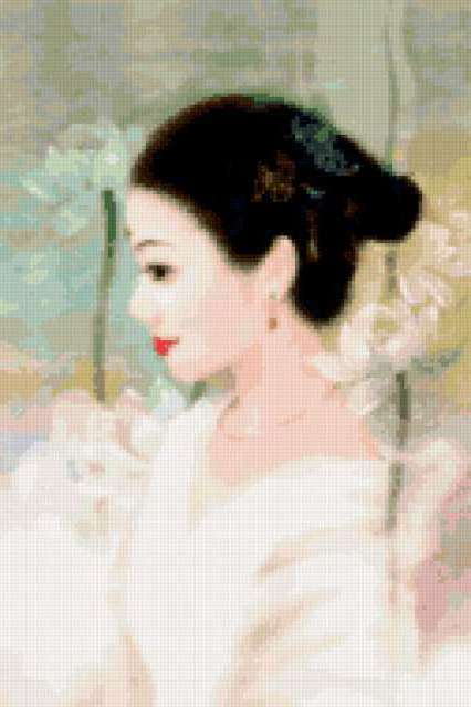 Ориентировочно так, схема вышивки «Krasivaja», созданная автором lukrecija12, будет выглядеть при отшиве на канве. Размер данной вышивки равен 126x189 крестов, при этом используется 50 цветов. Ключевые слова, по которым можно найти эту схему: zenshina, vostok. Также, вы можете взглянуть на оригинальную картинку, соответствующую данной схеме вышивки.