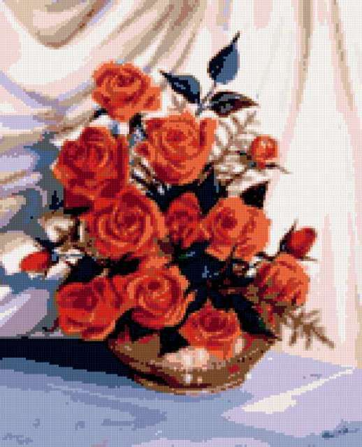 Ориентировочно так, схема вышивки «Krasnye rozy», созданная автором Lamisa, будет выглядеть при отшиве на канве. Размер данной вышивки равен 154x190 крестов, при этом используется 23 цветов. Ключевые слова, по которым можно найти эту схему: цветы, букеты, розы. Также, вы можете взглянуть на оригинальную картинку, соответствующую данной схеме вышивки.