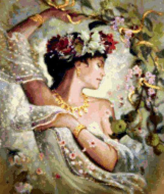 Ориентировочно так, схема вышивки «Lady», созданная автором aniela, будет выглядеть при отшиве на канве. Размер данной вышивки равен 161x190 крестов, при этом используется 86 цветов. Ключевые слова, по которым можно найти эту схему: lady, woman, женщина, девушка, дамa. Также, вы можете взглянуть на оригинальную картинку, соответствующую данной схеме вышивки.