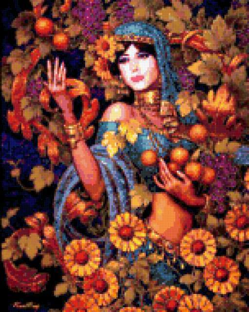 Ориентировочно так, схема вышивки «Lady», созданная автором aniela, будет выглядеть при отшиве на канве. Размер данной вышивки равен 152x190 крестов, при этом используется 81 цветов. Ключевые слова, по которым можно найти эту схему: lady, woman, женщина, девушка, дамa. Также, вы можете взглянуть на оригинальную картинку, соответствующую данной схеме вышивки.