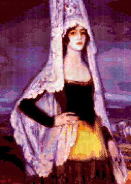 Ориентировочно так, схема вышивки «Lady», созданная автором aniela, будет выглядеть при отшиве на канве. Размер данной вышивки равен 135x190 крестов, при этом используется 58 цветов. Ключевые слова, по которым можно найти эту схему: lady, woman, женщина, девушка, дамa. Также, вы можете взглянуть на оригинальную картинку, соответствующую данной схеме вышивки.