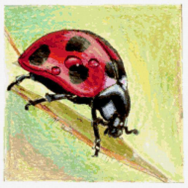 Ориентировочно так, схема вышивки «Ladybug», созданная автором aniela, будет выглядеть при отшиве на канве. Размер данной вышивки равен 190x190 крестов, при этом используется 69 цветов. Ключевые слова, по которым можно найти эту схему: wildlife, ladybug. Также, вы можете взглянуть на оригинальную картинку, соответствующую данной схеме вышивки.
