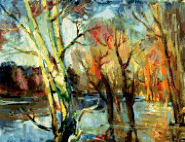 Ориентировочно так, схема вышивки «Landscape», созданная автором pandreevska, будет выглядеть при отшиве на канве. Размер данной вышивки равен 190x146 крестов, при этом используется 69 цветов. Ключевые слова, по которым можно найти эту схему: landscape, river, forest. Также, вы можете взглянуть на оригинальную картинку, соответствующую данной схеме вышивки.