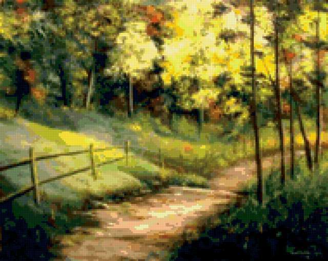 Ориентировочно так, схема вышивки «Landscape», созданная автором aniela, будет выглядеть при отшиве на канве. Размер данной вышивки равен 190x151 крестов, при этом используется 77 цветов. Ключевые слова, по которым можно найти эту схему: пейзаж, landscape. Также, вы можете взглянуть на оригинальную картинку, соответствующую данной схеме вышивки.