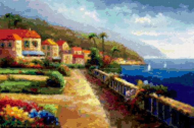 Ориентировочно так, схема вышивки «Landscape», созданная автором aniela, будет выглядеть при отшиве на канве. Размер данной вышивки равен 190x126 крестов, при этом используется 82 цветов. Ключевые слова, по которым можно найти эту схему: Landscape, seascape. Также, вы можете взглянуть на оригинальную картинку, соответствующую данной схеме вышивки.