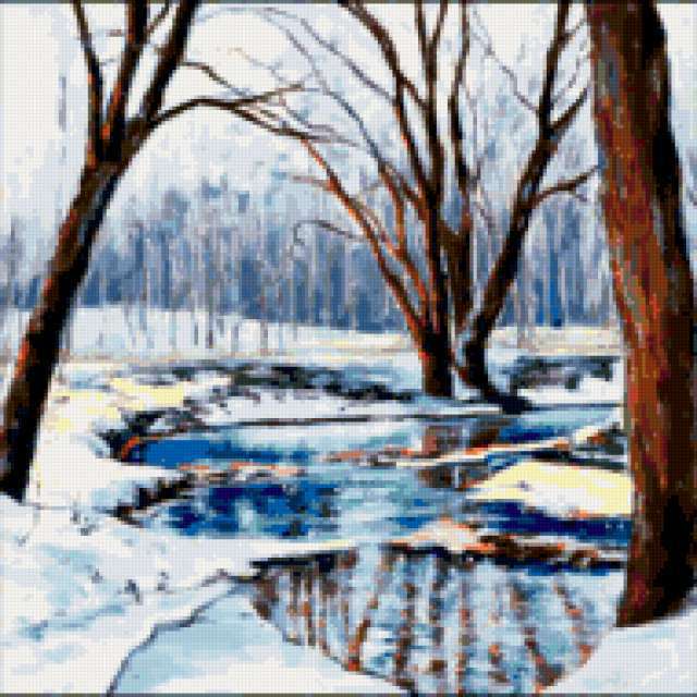 Ориентировочно так, схема вышивки «Landscape», созданная автором aniela, будет выглядеть при отшиве на канве. Размер данной вышивки равен 190x190 крестов, при этом используется 71 цветов. Ключевые слова, по которым можно найти эту схему: Landscape, winter. Также, вы можете взглянуть на оригинальную картинку, соответствующую данной схеме вышивки.