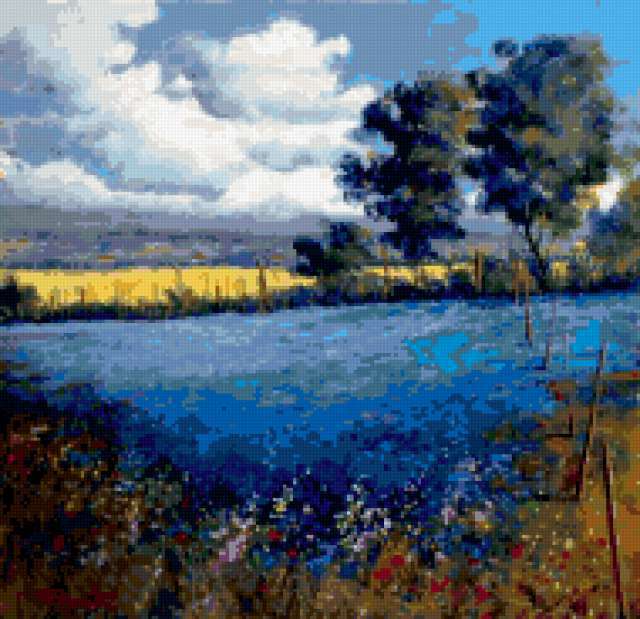 Ориентировочно так, схема вышивки «Landscape», созданная автором aniela, будет выглядеть при отшиве на канве. Размер данной вышивки равен 190x184 крестов, при этом используется 76 цветов. Ключевые слова, по которым можно найти эту схему: пейзаж, landscape. Также, вы можете взглянуть на оригинальную картинку, соответствующую данной схеме вышивки.