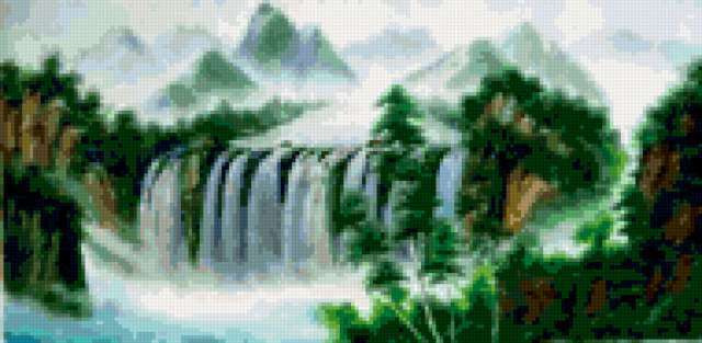 Ориентировочно так, схема вышивки «Landscape», созданная автором aniela, будет выглядеть при отшиве на канве. Размер данной вышивки равен 190x93 крестов, при этом используется 70 цветов. Ключевые слова, по которым можно найти эту схему: водапад, пейзаж, landscape, waterfall. Также, вы можете взглянуть на оригинальную картинку, соответствующую данной схеме вышивки.