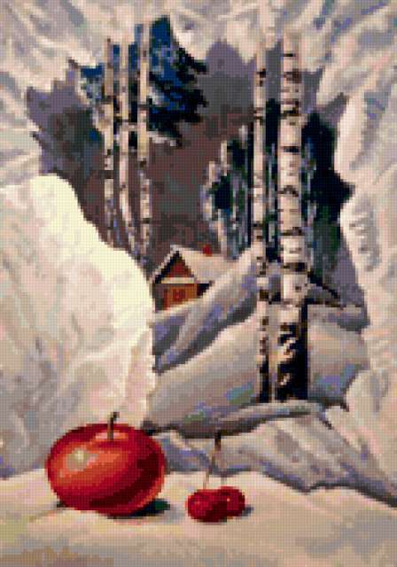 Ориентировочно так, схема вышивки «Landscape», созданная автором aniela, будет выглядеть при отшиве на канве. Размер данной вышивки равен 133x190 крестов, при этом используется 66 цветов. Ключевые слова, по которым можно найти эту схему: winter, пейзаж, landscape, зима. Также, вы можете взглянуть на оригинальную картинку, соответствующую данной схеме вышивки.