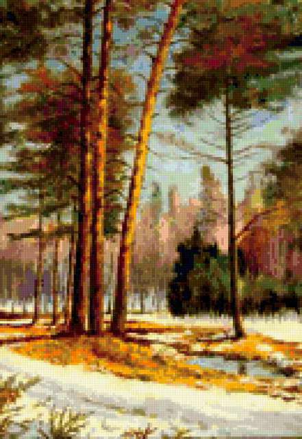 Ориентировочно так, схема вышивки «Landscape», созданная автором aniela, будет выглядеть при отшиве на канве. Размер данной вышивки равен 131x190 крестов, при этом используется 85 цветов. Ключевые слова, по которым можно найти эту схему: winter, пейзаж, landscape, зима. Также, вы можете взглянуть на оригинальную картинку, соответствующую данной схеме вышивки.