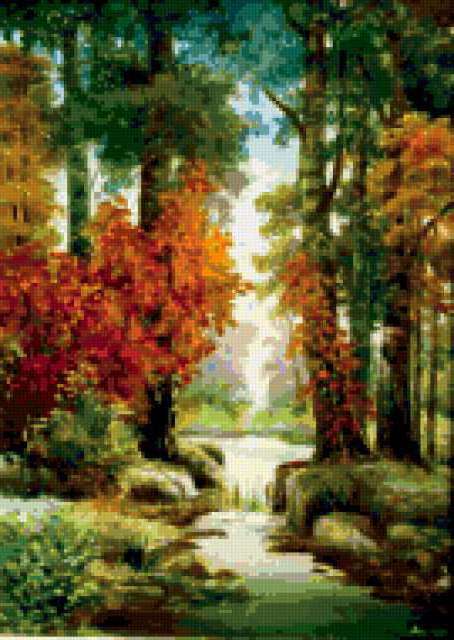 Ориентировочно так, схема вышивки «Landscape», созданная автором aniela, будет выглядеть при отшиве на канве. Размер данной вышивки равен 135x190 крестов, при этом используется 73 цветов. Ключевые слова, по которым можно найти эту схему: пейзаж, landscape, autumn. Также, вы можете взглянуть на оригинальную картинку, соответствующую данной схеме вышивки.