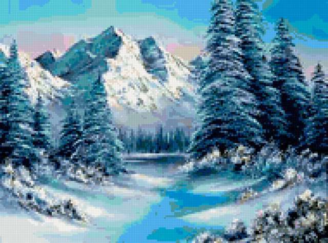 Ориентировочно так, схема вышивки «Landscape», созданная автором aniela, будет выглядеть при отшиве на канве. Размер данной вышивки равен 190x141 крестов, при этом используется 60 цветов. Ключевые слова, по которым можно найти эту схему: winter, пейзаж, landscape, зима. Также, вы можете взглянуть на оригинальную картинку, соответствующую данной схеме вышивки.
