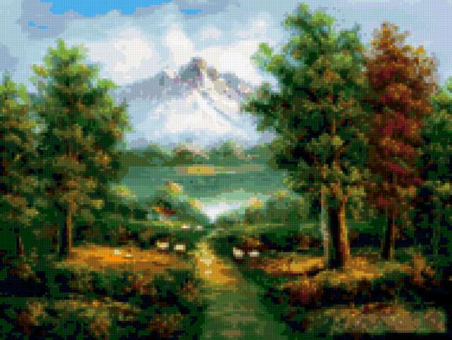 Ориентировочно так, схема вышивки «Landscape», созданная автором aniela, будет выглядеть при отшиве на канве. Размер данной вышивки равен 190x143 крестов, при этом используется 73 цветов. Ключевые слова, по которым можно найти эту схему: пейзаж, landscape. Также, вы можете взглянуть на оригинальную картинку, соответствующую данной схеме вышивки.