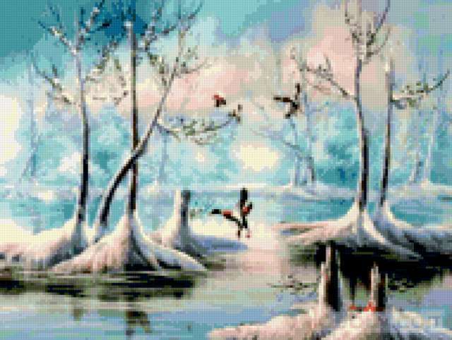 Ориентировочно так, схема вышивки «Landscape», созданная автором aniela, будет выглядеть при отшиве на канве. Размер данной вышивки равен 190x143 крестов, при этом используется 79 цветов. Ключевые слова, по которым можно найти эту схему: winter, пейзаж, landscape, зима. Также, вы можете взглянуть на оригинальную картинку, соответствующую данной схеме вышивки.