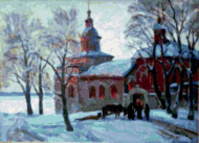 Ориентировочно так, схема вышивки «Landscape», созданная автором aniela, будет выглядеть при отшиве на канве. Размер данной вышивки равен 190x137 крестов, при этом используется 70 цветов. Ключевые слова, по которым можно найти эту схему: winter, пейзаж, landscape, зима. Также, вы можете взглянуть на оригинальную картинку, соответствующую данной схеме вышивки.